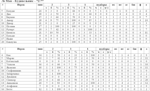 Киевские «гладиаторы» сегодня стали ещё на один шаг ближе к следующему раунду Еврокубка. «Будивельник» на выезде сумел переиграть французский «Ле Ман» и тем самым укрепиться на первой строчке квартета «J». Команды начали встречу без раскачки. Особенно активно в первые минуты среди подопечных Беррокаля выглядели Морли и Уилсон. Игра получалась очень результативной, практическая каждая из атак соперников заканчивалась точным броском. Все с нетерпением ждали появления на паркете в составе киевлян Спенсера. Кроме того, что этот еврокубковый матч был дебютным для Деворика в этом сезоне, так ещё и соперник, против которого пришлось играть – предыдущий клуб защитника. Несмотря на относительно равную игру, которую демонстрировали команды, гостям удалось немного прибавить под занавес первой десятиминутки и уйти на первый короткий перерыв с преимуществом в девять очков. Во второй четверти «Ле Ман», усилиями Аккера постепенно начал сокращать разницу в счёте. На результативные действия французского баскетболиста в составе «строителей» попеременно своими попаданиями отвечали Кис и Яковлев. Первая половина закончилась со счётом 37:40 в пользу гостей.