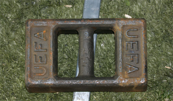 Загадочная турецкая душа. Такие металлические бруски с символической надписью УЕФА не дают упасть рекламным считам, которыми окружено поле. Зачем логотип на ржавом металле - вопрос.