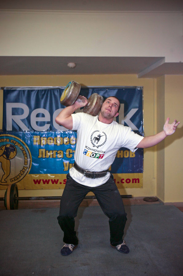 Вправа «Dumbbell» («Гантель») - підняття великої гантелі вагою 80 кг однією рукою над головою на максимальну кількість разів за 90 секунд. АТЛЕТ – Володимир Рекша
