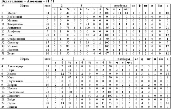Сумел перервать череду поражений в матчах с «Азовмашем» сегодня киевский «Будивельник». Напомним, что «гладиаторы» последний раз добивались успеха в противостояниях с «машиностроителями» в прошлогодней финальной серии. Подопечным Беррокаля удалось на домашнем паркете более чем убедительно переиграть мариупольцев с преимуществом в двадцать очков. Начиналось всё для команды Ярутиса довольно неплохо, Рамел Карри в двух атаках подряд сделал счёт 0:4 в пользу гостей. Лидировать «бело-синим» удавалось на протяжении всей первой четверти. В составе «Будивельника» наибольшее сопротивление «львам» оказывал Анисимов, а за 30 секунд до конца десятиминутки центровому киевлян удался точный трёхочковый, который сделал счёт 19:20. Вторая четверть прошла в том же ключе, Оуэнс и Хаус продолжали удерживать «Азовмаш» в роли лидера, а Кис и Анисимов не давали вырасти разнице в счёте до недосягаемой. Впервые выйти вперёд «гладиаторам» удалось под занавес периода, точным броском из-за дуги отметился Забирченко – 39:37. Настоящий перелом в матче начался с третьей четверти. Дальними попаданиями в нескольких атаках отметился Ламейн Уилсон, а всё тот же Анисимов продолжал штамповать очки из «трёхсекундки», где ему практически не было равных. Перед заключительной четвертью «Будивельник» уже имел преимущество в 12, очков, что, безусловно, только увеличивало шансы «строителей» на победу. Алексендер и Пашалич предприняли попытку спасти игру, но разбросавшийся Уилсон продолжал поражать корзину «Азовмаша». Финальная сирена зафиксировала победу хозяев паркета со счётом 91:71.