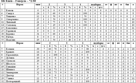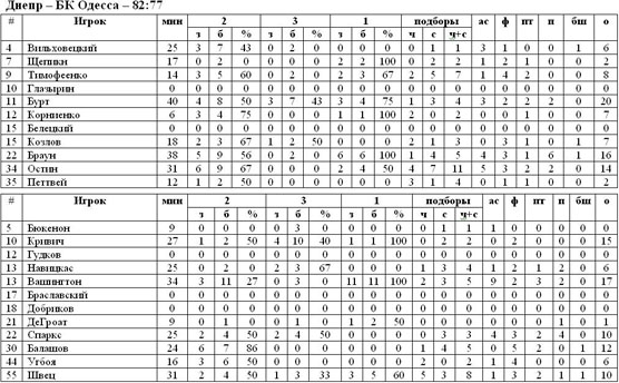 Первую победу в чемпионате после триумфа в рамках Кубка Суперлиги сумел сегодня одержать «Днепр». Напомним, что подопечные Журавлёва уже успели потерпеть три поражения в трёх турах подряд, сегодня же днепропетровцы не без труда добыли два очка в матче против Одессы. Свой настрой на победу «Днепр» начал демонстрировать уже в первые минуты матча. После трёхочкового от Кривича, хозяева сумели организовать рывок 1:12, который вынудил Юшкина взять тайм-аут. Навицкас, Угбоя и Швец принялись отыгрывать отставание, но благодаря усилиям Буртта первая четверть закончилась со счётом 24:16 в пользу «Днепра». Во втором периоде игра стала более равной, но хозяева по-прежнему удерживали инициативу в своих руках. Днепропетровцы продолжали уверенно лидировать до самой финальной сирены, одесситы несколько раз благодаря результативной игре Спаркса и Вашинтона сокращали разницу в счёте до 4-5 очков, но всё же сдержать сегодня Брауна и Буртта было просто невозможно. Именно эта пара легионеров и подарила команде Журавлёва победу со счётом 82:77.
