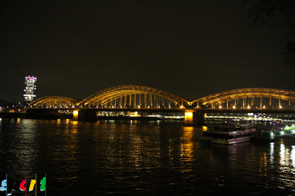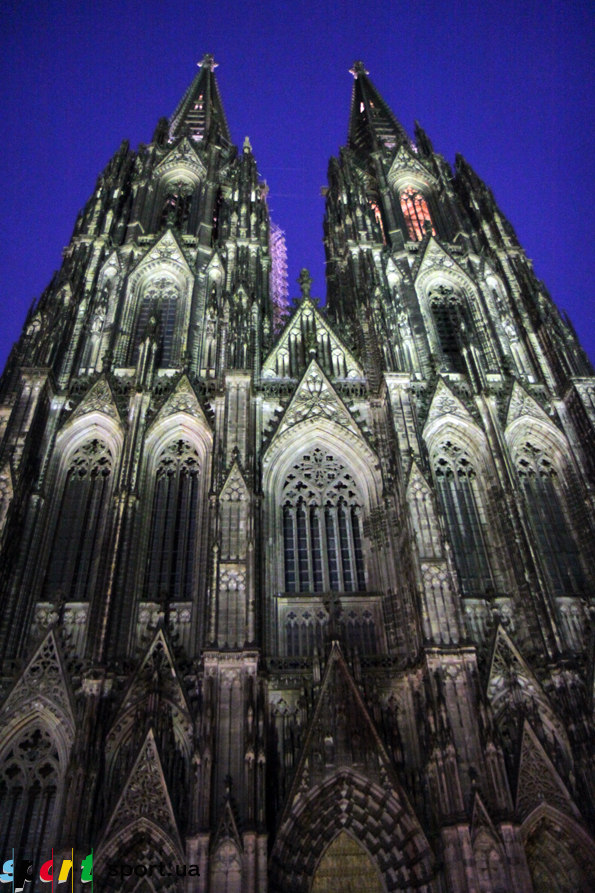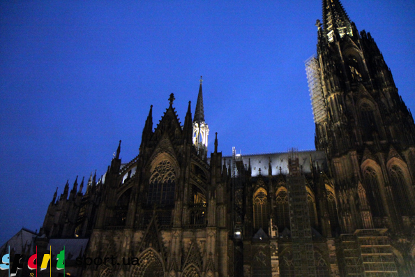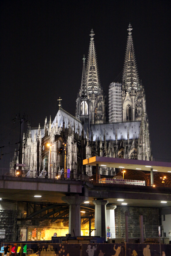 После посещений всех обязательных мероприятий вроде пресс-конференций и открытых тренировок, было решено отправиться в Кельн, находящийся в 15-ти минутах езды на электричке. Возле ж/д вокзала одного из самых больших городов Германии расположена самая главная достопримечательность Кельна – Кельнский собор! Фантастическое сооружение, которое ночью выглядит даже несколько устрашающе. 160-ти метровое здание в готическом стиле – не самое яркое впечатление :) Тем более, что с подсветкой собора явные проблемы, так как она практически отсутствует. Зайти внутрь не удалось по причине позднего прибытия – все уже было закрыто.