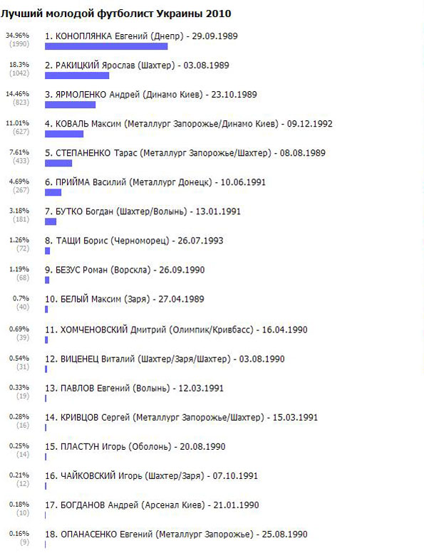 На протяжении двух месяцев посетители нашего спортивного портала, ведущие средства массовых информаций и редакция сайта Sport.ua определяли лучшего молодого футболиста 2010 года. По итогам открытого голосования лучшим футболистом в возрасте до 21 года стал полузащитник «Днепра» и сборной Украины Евгений Коноплянка, который в упорной борьбе опередил защитника «Шахтера» Ярослава Ракицкого.
