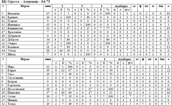 Эта неделя в Суперлиге стала весьма неудачной для тройки лидеров чемпионата. Проиграли свои матчи «Будивельник», БК Донецк, не стал исключением и «Азовмаш», который сегодня на выезде уступил Одессе. Следует отметить, что захватить инициативу в свои руки подопечным Юшкина удалось с первых минут, ДеГроат двухочковым попаданием вывел «акул» вперёд, после этого одесситы роль лидера матча уже не теряли. Блестящая игра Вашинтона и всё того же ДеГроата уже за первую десятиминутку обеспечила хозяевам паркета преимущество в девять очков. Балашов, Швец и Навицкас в дебюте второй четверти делают счёт 25:10 и обрекают «машиностроителей» на неприятную роль догоняющих. Подобраться подопечным Ярутиса довольно близко к оппоненту удавалось дважды. Сначала Пашалич и Пустозвонов под занавес первой половины сократили разницу до шести пунктов, а второй раз в середине последней десятиминутки Карри сделал счёт 63:60. В этот момент показалось, что чемпиону удастся переломить ход поединка и выйти вперёд, но уже в который раз блестящую концовку выдал Вашинтон. Именно благодаря американцу БК Одесса удержала своё преимущество и добилась такой важной победы со счётом 84:75.
