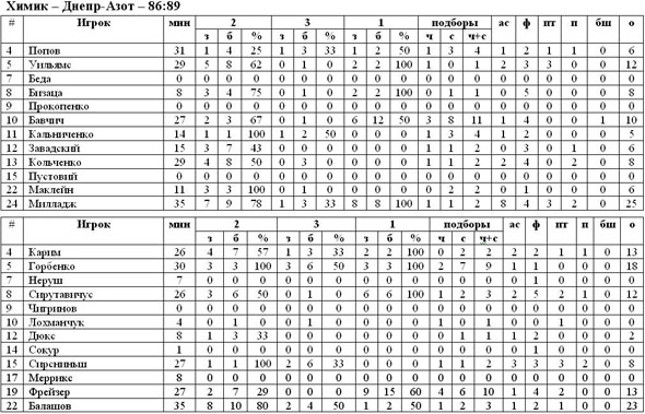 Настоящей драмой сегодня закончился матч в Южном, где «Химик» принимал «Днепр-Азот». Более удачно в этом противостоянии стартовали хозяева паркета и уже в начале матча счёт был 15:6 в пользу «бело-зелёных». Усилиями Фрейзера и Сирсниньша подопечным Игоря Чигринова ещё до конца первой четверти удалось существенно сократить разницу в счёте. Команды отправились на первый короткий перерыв при счёте 22:21. Второй период прошёл в более равной борьбе, у днепродзержинцев разбросались Горбенко и Балашов, которые довольно стабильно «бомбардировали» корзину южненцев. В составе «Химика» традиционно мощно выглядел Миллэдж, защитнику удавалось не только атаковать с хорошим процентом, но и блестяще ассистировать партнёрам по команде. Куртис за всё игровое время в этом матче отдал восемь результативных передач. Самые интересные события припали на конец четвёртой четверти. За 20 секунд до конца основного времени гости имели преимущество в 5 очков. Всё тот же Миллэдж на пару с Вильямсом смогли сравнять счёт, при чём Лоренцо сделал свой точный бросок за 2,2 секунды до финальной сирены (86:86). После тайм-аута, который взял Чигринов, мяч оказался в руках у Фрейзера, центровой отдал пас на Сирсниньша и Ринальдс метров с восьми трёхочковым броском вместе с сиреной поразил корзину «Химика», подарив своей команде победу со счётом 86:89.