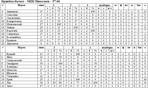 Матч между принципиальными соперниками сегодня состоялся в Кривом Роге, «Кривбассбаскет» принимал МБК Николаев. Дважды команды встречались в этом сезоне, дважды зрители на трибунах наблюдали нервные концовки, не стал исключением и сегодняшний матч. Более удачно начало поединка сложилось для хозяев паркета. В первые пять минут Зайцев и Кондратовец сумели организовать рывок для своей команды – 14:6. Криворожцы продолжали удерживать это преимущество на протяжении ещё десяти минут, погоню за «красно-белыми» в составе муниципалов сумел организовать Джастин Лав. Защитник с завидной стабильностью атаковал со средней дистанции и с каждой атакой сокращал разницу в счёте. На перерыв команды отправились при счёте 31:30 в пользу подопечных Чурсина. Уже на первой минуте очередного периода Брайан Грин дальним броском вывел Николаев вперёд, с этого момента на паркете начались «качели». Команды попеременно выходили вперёд, и разница в счёте была незначительной. Ключевую роль в этой встрече сыграл известный уже всем николаевский зонный прессинг, который команда Берестнева особо активно применяла во второй половине. Несколько раз Яйло на пару с Мажутисом удавалось организовывать перехваты, просто вырывая мяч из рук Зайцева прямо в трёхсекундной зоне. Всё тот же Лав стал главным творцом победы «корабелов», американцу удалось совершить несколько точных бросков, в том числе и с линии штрафных, в последние три минуты, которые и склонили чашу весов в пользу гостей. 57:66 – заслуженная победа Николаева.