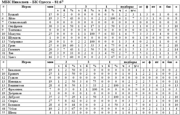 Вбрасывание выиграли гости, но открыть счёт в первой же атаке одесситы не смогли. Спустя минуту точным двухочковым в быстром прорыве отметился Онуфриев, сделав счёт 2:0 в пользу «корабелов». Перелом игры начался уже в середине четверти: Грин, Гилевич и Яйло за несколько минут сумели увеличить разницу в счёте до десяти очков. Игра в атаке у гостей совсем разладилась, проходы под кольцо Вашинтона заканчивались потерями или блоками, а дальние попытки Спаркса и Навицкаса не достигали цели. На протяжении шести минут актив подопечных Юшкина составлял всего восемь пунктов, что давало возможность хозяевам паркета наращивать своё преимущество. Два дальних попадания под занавес второй четверти от Умбрашко и Онуфриева сделали счёт 39:23 в пользу МБК Николаев. В оставшихся двух четвертях подопечные Берестнева сумели продемонстрировать своё превосходство в борьбе за подборы, Лав и Яйло особенно преуспевали в этом компоненте. В начале заключительной четверти благодаря дальним попаданиям Навицкаса и Вашинтона Одесса сократила счёт до шести очков, и этот момент вполне мог стать переломным, но своевременно набранные очки Грина, несколько перехватов Лава и Мажутиса подстегнули команду и снова сделали преимущество МБК Николаев недосягаемым для соперника. Финальная сирена зафиксировала победу команды Берестнева со счётом 81:67.