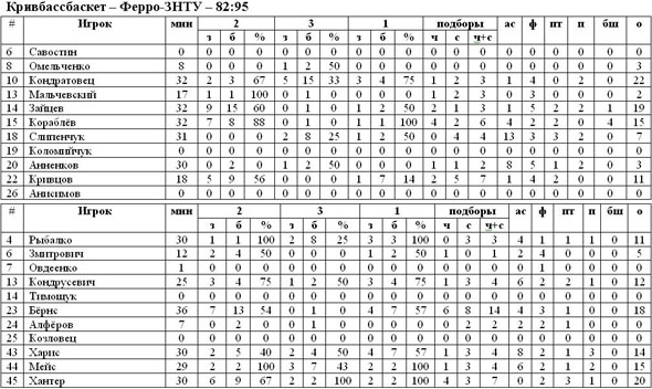 Кривцов и Зайцев уже в дебюте встречи вывели хозяев паркета вперёд, но Хантер и Харис не давали «Кривбассбаскету» уйти в солидный отрыв. Традиционно результативно действовали на протяжении двадцати минут Зайцев и Кораблёв, именно их попадания позволяли криворожцам иметь отрыв в 5-7 пунктов. Первая половина закончилась со счётом 44:40 в пользу Кривого Рога, что в перерыве давало повод для размышлений Кириллу Большакову. Видимо, наставник запорожского клуба в раздевалке сумел подобрать нужные слова, для того чтобы во второй половине зрители увидели на паркете совсем другой «Ферро». Хантер и Рыбалко за каких-то три минуты сумели реализовать четыре трёхочковых и вывести свою команду вперёд. Ликвидировать отставание у хозяев принялся Кондратовец, Виктор пытался сократить разрыв бросками из-за дуги, выбросив только во второй половине 13 дальних, 4 из которых попали в цель. Этих действий защитника «Кривбассбаскета» оказалось недостаточно, всё те же Бёрнс и Хантер продолжали наращивать преимущество гостей. Следует отметить, что запорожцы сегодня сумели переиграть соперника в борьбе за отскоки, больше всего подборов на счету Бёрса (14). Окончательно посыпалась команда Чурсина в заключительные пять минут, «бело-зелёные» не оставили никаких шансов своим соперникам и одержали победу со счётом 82:95.