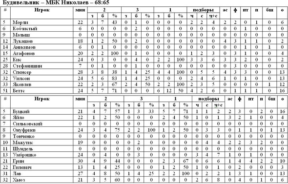 Киевский «Будивельник» сегодня в СК «Меридиан» принимал набравший ход МБК Николаев, встреча для «гладиаторов» получилась очень непростой, подопечные Беррокаля смогли вырвать победу буквально в концовке, при этом находясь в роли догоняющих практически всё игровое время. Уже в первой четверти команды смогли наглядно продемонстрировать, на сколько упорным будет противостояние, наибольшая разница в счёте, которой соперникам удалось достигнуть в первые десять минут, была равна все трём очкам. У Киева Лучше всех выглядел Беттс, центровой «гладиаторов» не раз переигрывал под щитом Хьюза, вынуждая пятого номера николаевцев постоянно на себе фолить. Гостям же удавалось в основном удерживаться за счёт разящих проходов под щит Буцкого и Грина. Во втором периоде подопечные Берестнева заметно активизировались, два дальних попадания Онуфриева дали толчок «бело-синим» и позволили приблизить своё преимущество к десяти очкам. Усилиями Уильямса и Спенсера киевлянам удалось немного сократить отставание и на большой перерыв команды ушли при счёте 26:33. Во второй половине игра у хозяев паркета по-прежнему не клеилась, бесконечное количество бросков из-за дуги в исполнении Киса, Уилсона, Лукашова не достигали цели, в то время как николаевцы продолжали уверенно лидировать. Ключевым эпизодом в матче стала середина заключительной четверти. Инициативу в свои руки взял Яковлев и, следует отметить, сделал он это весьма оправдано. Дважды отметившись точными трёхочковыми и сделав несколько подборов, украинец смог не только завести команду, но и сократить отставание. Несколько подряд ошибок в нападении в исполнении Лава и Грина в концовке дали возможность «Будивельнику» вырваться вперёд. Интрига на паркете сохранялась до последних секунд, но всё же второй раз в текущем сезоне МБК Николаев переиграть киевскую команду не удалось. «Гладиаторы» одержали непростую победу с итоговым счётом 68:65.