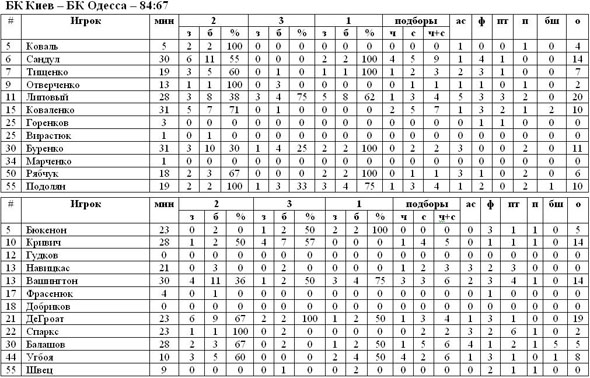 Одержал сегодня победу и другой столичный клуб – БК Киев. Подопечные Виталия Черния во второй раз в этом сезоне на домашнем паркете смогли переиграть БК Одессу. В очередной раз желания и воли к победе молодых баскетболистов киевской команды оказалось достаточно, чтобы переиграть более грозного соперника, соперника, у которого состав выглядит куда более предпочтительно. Начали команды встречу довольно нервно, чуть более двух минут счёт на табло оставался 0:0, набрать первые очки удалось именно гостям, Джон ДеГроат в свойственной ему манере сумел забить два с фолом. У киевлян, броском из трёхсекундной зоны, сопернику смог ответить Сандул. Сразу после этого подопечные Юшкина постарались применить своё главное оружие – дальние броски. Точные выстрелы всё того же ДеГроата и Бюкенона мгновенно увеличили разрыв до +6 для гостей. Впервые выйти вперёд игрокам БК Киев удалось в середине второй четверти, именно с этого момента и начался победный спурт «волков». Усилиями Липового и Сандула столичные баскетболисты продолжали наращивать обороты и увеличивать разницу в счёте. Кроме этого, Виталий Черний сделал ставку на активный прессинг, который дал свой результат. Рябчук, Подолян и Буренко вынуждали ошибаться визитёров, что привело к 21(!) потере одесских баскетболистов за всё игровое время. В оставшееся время киевлянам удалось сдержать натиск БК Одессы, доведя уверенно матч до победы со счётом 84:67.
