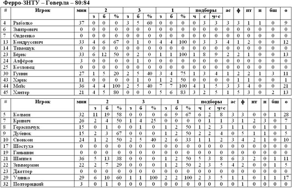 Ивано-франковская «Говерла» сегодня в Запорожье смогла перервать победную серию местной команды, которая не проигрывала пять матчей подряд. Подопечные Евгения Мурзина захватили инициативу в свои руки с самого начала, уже спустя три минуты Колмен, Кривич и Зиммерман смогли организовать для гостей уверенный рывок – 13:4. Усилиями Мейса и Хантера хозяевам паркета некоторое время удавалось удерживать разницу в 5-6 пунктов, провальным же для подопечных Большакова стала вторая десятиминутка. Улянко, Колмен и Шаппел уже к середине четверти сделали счёт +12 для «Говерлы», что весьма усложняло соперникам задачу на успех. «Медведи» смогли переиграть «Ферро» в основном за счёт плотной персональной опеки в защите, а также за счёт собранных Колменом и Шаппелом подборов. Ивано-франоковцы удержали победный для себя счёт до конца матча. Справедливости ради следует отметить, что Хантеру и Рыбалко существенно удалось сократить разницу в концовке, но на большее запорожских баскетболистов не хватило. Победа за «Говерлой» со счётом 80:84.