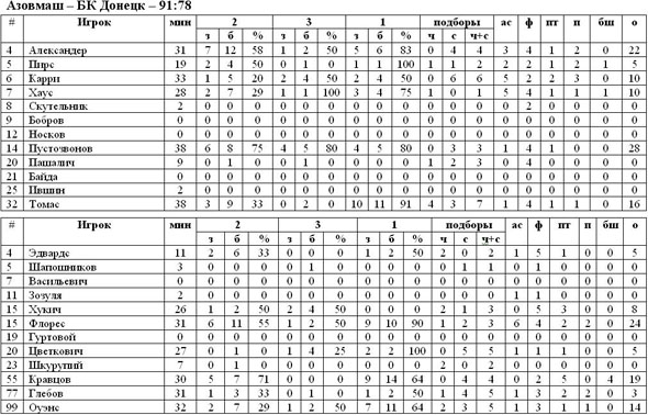 Безусловно, центральным матчем тура было противостояние двух представителей Донбасса – «Азовмаша» и БК Донецк. Команды находятся в верхней части турнирной таблицы, так что их очное противостояние способно решить много, в плане распределения мест. Упорная борьба на паркете воцарилась с первых минут, на протяжении нескольких атак команды попеременно сменяли друг друга на позиции лидера, задать тон успешным действиям мариупольцев сумели Александер и Томас, в результате чего «львы» под занавес первой четверти получили преимущество в десять очков. В дебюте второй десятиминутки Флорес, Кравцов и Оуэнс смогли сократить разницу в счёте до двух очков, но точный дальний от Карри и двухочоковое попадание всё того же Томаса, вновь отбросили БК Донецк назад. Во многом определяющей стала результативная игра Пустозвонова, активность лёгкого форварда «машиностроителей» во второй половине позволила команде Ярутиса существенно увеличить разницу в счёте. Максим был точен в четырёх из пяти попытках дальних бросков и при этом отметился тремя подборами. Сверхрезультативность Флореса, Кравцова и Оуэнса не помогла команде Обрадовича хотя бы приблизиться к сопернику. Матч закончился уверенной победой «Азовмаша» со счётом 91:78.