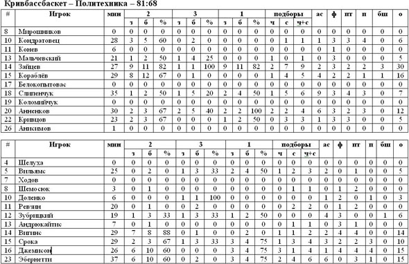 «Кривбассбаскет» на домашнем паркете сегодня сумел преподнести очередной сюрприз своему сопернику, в роли которого выступала львовская «Политехника». Равная игра на паркете велась на протяжении первых двух четвертей, у гостей традиционно мощно выглядел Вигинс, в паре с которым неплохо смотрелся и Эбернетти. Защитнику «галичан» удавалось не только поражать корзину криворожцев, но и отдавать результативные передачи на партнёров по команде. Первая половина завершилась со счётом 37:37, основные события припали на оставшиеся две десятиминутки. В очередной раз повёл за собой команду Зайцев, центровой «Кривбассбаскета» практически безошибочно атаковал из трёхсекундной зоны, реализовав 9 из 11 бросков. Кроме этого на счету пятого номера 9 собранных отскоков, которые в купе с 30-ю очками практически составили дабл-дабл. После того, как преимущество хозяев паркета достигло двадцати очков, стало ясно, что победу команда Чурсина уже не упустит. Финальная сирена зафиксировала уверенную победу Кривого Рога со счётом 81:68.