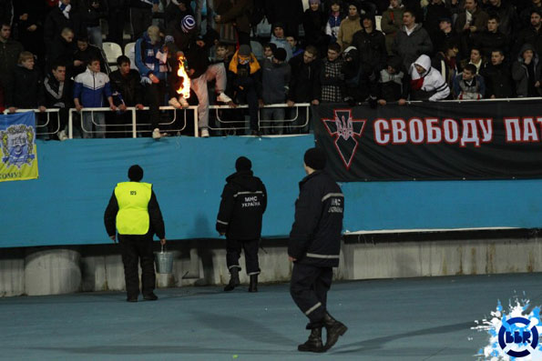Первый тайм прошел спокойно, и на трибунах была нормальная атмосфера, да фанаты запускали дымовые шашки, палили фаера, бросали петарды, но в этом ничего криминального нету, в той же Италии это обязательный атрибут каждого футбольного матча.