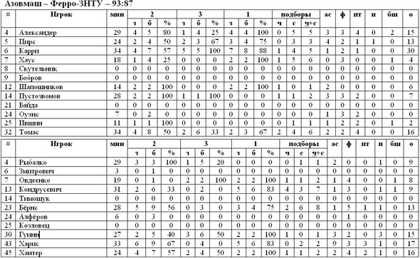 Противостояние между «Азовмашем» и «Ферро» носило принципиально важный характер для обеих команд. Мариупольцы стараются удержаться на третьей строчке до начала плей-офф, а вот запорожцы после вчерашнего триумфа Николаева, потеряли пятое место. Начали встречу соперники очень неуверенно, после попаданий Пустозвонова и Хантера на протяжении нескольких минут никто не мог поразить корзину. В очередной раз инициативу на себя взяли Карри и Александер. Результативные броски американцев сделали преимущество «Азовмаша» равным десяти очкам и отправили на первый короткий перерыв подопечных Ярутиса в роли лидеров.