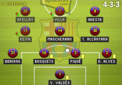 Как видим, из «золотого» состава «Барсы» в этой игре на поле вышли только - Виктор Вальдес (несменный страж ворот, который здорово выручил свою команду на последних минутах игры с «желтой субмариной»), Дани Алвеш и Жерар Пике (основные защитники), Серхио Бускетс (который вынужден в отсутствии Карлеса Пуйоля закрывать позицию центрального защитника), и футболисты группы атаки - Давид Вилья и Андреас Иньеста. Всего шесть футболистов в основном составе «Барселоны» при трех травмированных и двух игроках, которым Гвардиола дал немного перевести дух накануне важной встречи Лиги чемпионов.