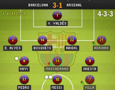 А вот та же игра против «Арсенала», только на этот раз в Каталонии лишь доказывает тот факт, что левый фланг «Барселоны» не может работать на все 100% на протяжении всей игры. Гвардиола очень часто применяет замены, касающиеся этой линии. На этот раз Пеп сменил и Адриано, и Давида Вилью, несмотря на то, что команда добыла уверенную победу 3:1, а у соперника практически не было шансов для спасения (если не считать автогол Бускетса).