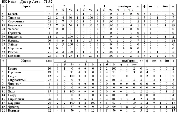 Столичный БК Киев, безнадёжно засевший на дне турнирной таблицы, сегодня в СК «Меридиан» принимал амбициозный «Днепр-Азот». Днепродзержинцы несмотря на приличный подбор игроков никак не могут поймать нить побед, которая то и дело ускользает из рук подопечных Чигринова. «Трёхцветные» ещё не утратили шансов попасть в плей-офф и в сегодняшнем матче сделали ещё один шаг навстречу восьмому месту. Открыли счёт хозяева паркета, сначала Коваленко точно исполнил два штрафных, а уже в следующей атаке Тищенко сделал счёт 4:0. Гости смогли распечатать корзину киевлян лишь спустя две минуты. «Волки» уверенно удерживали инициативу на протяжении первых восьми минут, днепродзержинцы впервые смогли выйти вперёд после двухочкового попадания Дюкса – 15:16. На перерыв команды всё же ушли при счёте 22:19 в пользу БК Киев. На протяжении последующих двух четвертей игра проходила в том же ритме, разница не превышала пяти очков, а лидер менялся несколько раз. Перелом случился в дебюте заключительного периода. Фрейзер и Неруш за три минуты организовали рывок для «Азота» и вывели свою команду вперёд на 15 пунктов. Стало ясно, что совершить камбэк подопечным Черния не по силам. Гости уверенно сохранили преимущество и одержали важную победу со счётом 72:82.