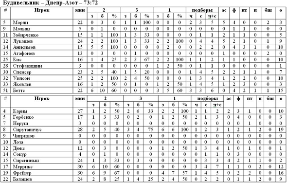 Именно гости первыми открыли счёт, Майкл Фрейзер из-под кольца набрал два очка, в следующей же атаке Забирченко точным трёхочковым вывел вперёд «Будивельник». Лукашов, Анисимов и Уилсон смогли немного оторваться от «Азота» и к середине четверти сделать счёт 11:6. Сирутавичус и Меррикс бросились сокращать отставание и делали они это вполне успешно, так как к концу первой четверти гости сумели выйти в лидеры на два очка – 21:23. Казалось, что во второй десятиминутке киевляне прибавят и смогут уверенно сделать рывок, но гости не спешили уступать. Всё тот же Сирутавичус на пару с Фрейзером продолжали штамповать набранные очки, удерживая «Будивельник» на расстоянии. Владеть инициативой днепродзержинцам удавалось вплоть до середины заключительной четверти. Своё весомое слово сумел сказать центровой киевлян – Беттс, пятый номер неплохо действовал «спиной» под кольцом и не раз забрасывал «крюком». Сирсниньш за две минуты до конца сделал счёт 69:72, подарив «Азоту» шанс на победу, при этом у «Будивельника» оставалась минута, чтобы всё исправить. В следующей атаке Беттс положил очередные два очка в корзину гостей, а за несколько секунд до финальной сирены Спенсер попал со средней – 73:72, установив окончательный счёт в матче. Благодаря этому успеху столичный клуб вновь взобрался на первую строчку в турнирной таблице, теперь киевляне опережают БК Донецк лишь по дополнительным показателям.