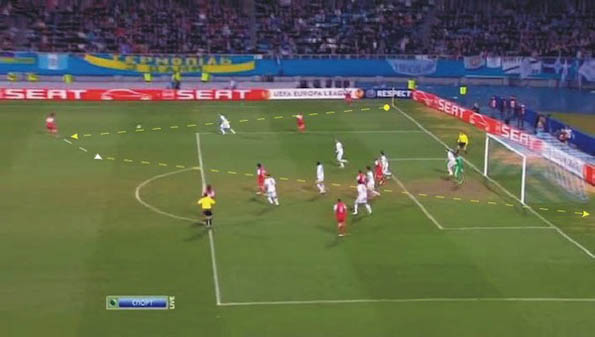 Атаковали гости преимущественно флангами, и (вследствие очевидного преимущества игроков «Динамо» в антропометрических данных) старались держать мяч внизу. Даже их розыгрыши стандартов заключались в распасовке низом - за весь матч я насчитал лишь 3 подачи на второй этаж штрафной ДК.