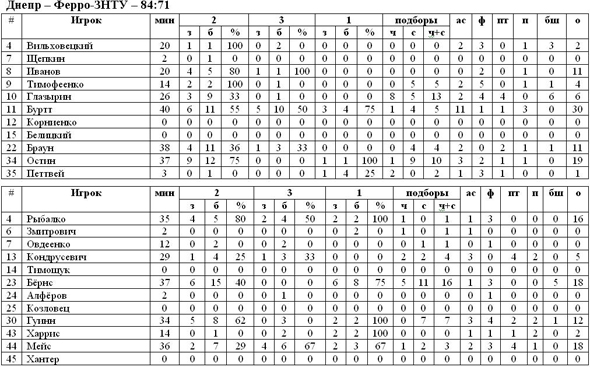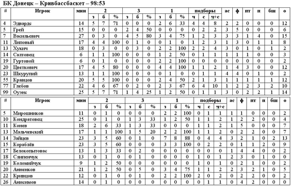 БК Донецк в сегодняшнем домашнем противостоянии с «Кривбассбаскетом» сумел вернуть себе первое место, обыграв гостей более чем уверенно. Оказывать достойное сопротивление «тиграм» удавалось лишь на протяжении первых пяти минут, точные броски в исполнении Кораблёва и Зайцева какое-то время удерживали криворожцев наравне с донецкой командой. Начиная с середины четверти роль «первой скрипки» в составе «тигров» уверенно исполнял Эдвардс. На пару с Глебовым центровой сумел организовать рывок для своей команды и сделать счёт 21:12, но на перерыв всё же команды ушли при семиочковом отставании «Кривбассбаскета». Держаться на расстоянии 7-10 очков от БК Донецк подопечным Чурсина удавалось до середины третьей десятиминутки. Васильевич и Оуэнс мгновенно взвинтили темп и за каких-то две минуты сделали счёт 64:40. До финальной сирены команда Обрадовича продолжила наращивать обороты и уходить в отрыв, завершив встречу со счётом 98:53. Таким образом «тигры» вновь обошли в турнирной таблице «Будивельник», имея на одну игру больше, нежели киевляне.