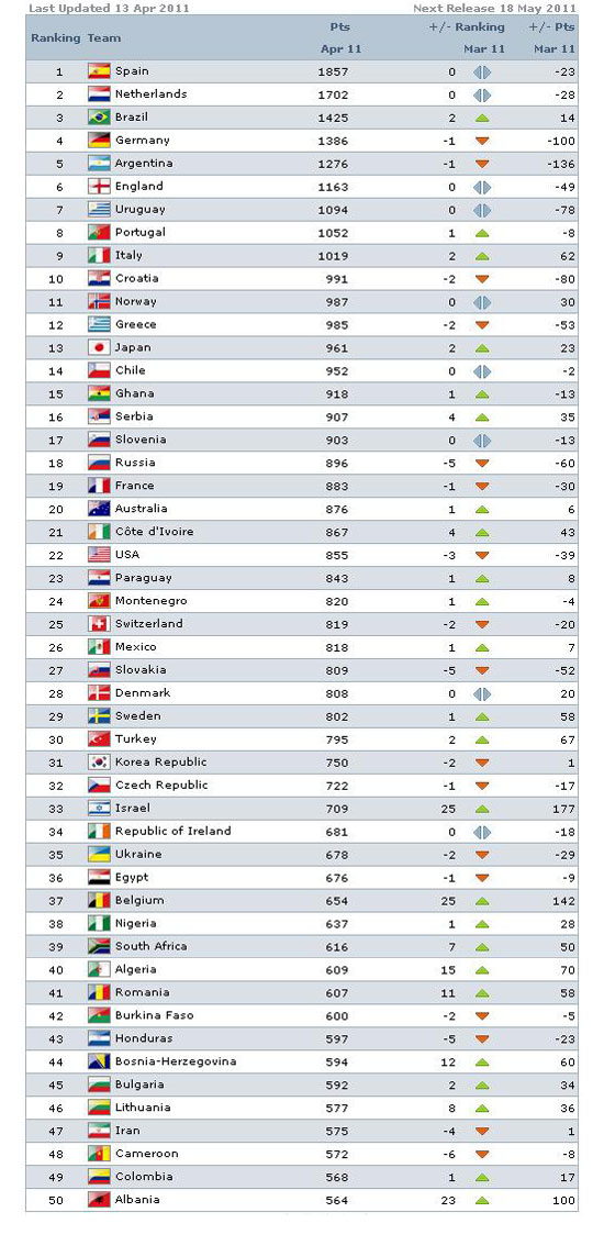 На вершине вновь испанцы, за ними следует сборная Нидерландов. А вот, кто вернулся в тройку лидеров, так это Бразилия, подвинувшая команду Германии. Кроме того, в десятку сильнейших ворвалась Италия и обосновалась на 9-й строчке.