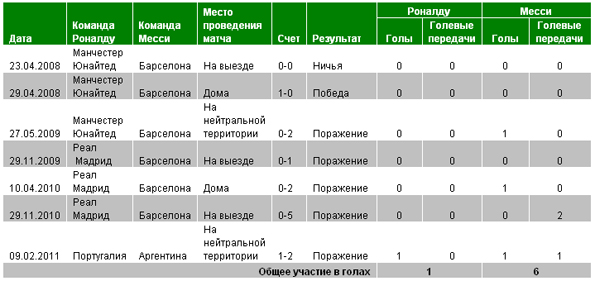 риштиану Роналду Игрок Лионель Месси 20 Дома 14 8 На выезде 15 Криштиану Роналду Игрок Лионель Месси 3 Голы, забитые головой 1 18 Голы, забитые правой ногой 3 7 Голы, забитые левой ногой 25 Криштиану Роналду Игрок Лионель Месси 24 Голы, забитые из штрафной 24 4 Голы, забитые из-за пределов штрафной 5