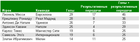 Пять ведущих европейских лиг 2010/11: голы + результативные передачи