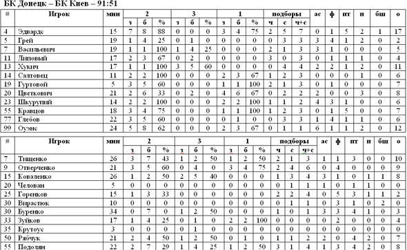 Пятница порадовала любителей баскетбола четырьмя матчами Суперлиги. В одном из них БК Донецк принимал на своём паркете аутсайдера чемпионата – БК Киев. Ещё до начала матча было ясно, что соперники находятся в разных весовых категориях, поэтому особого сопротивления подопечные Обрадовича не испытали. Отметим, что на протяжении первых восьми минут именно гости удерживали инициативу в своих руках. Дальние попадания от Коваленко, Тищенко, Рябчука и Буренко постоянно давали преимущество «волкам» в 2-3 очка. Джастин Грей под занавес первой десятиминутки двухочоковым броском вывел Донецк вперёд – 17:16, после чего хозяева паркета прибавили ещё больше. Сказалась разница в классе исполнителей, занимающих позиции в передней линии. Эдвардз и Хукич зачастую просто не замечали оппонентов под щитами и продолжали увеличивать преимущество для БК Донецк. Уже в середине третьей четверти, когда преимущество хозяев паркета перевалило далеко за 20 очков, стало ясно, что Киеву не миновать ещё одного поражения в этом сезоне. Встреча завершилась уверенной победой «тигров» со счётом 91:51.