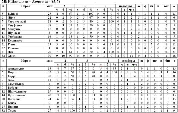Муниципальный баскетбольный клуб из Николаева просто не замечает соперников. После выездной победной серии и уже забронированного пятого места в турнирной таблице, сегодня «корабелы» на домашнем паркете обыграли мариупольский «Азовмаш». Первая четверть осталась именно за гостями. Уверенная игра в исполнении Пашалича и Томаса сразу же вывела вперёд «Азовмаш», николаевцы же остались в роли догоняющих. Ликвидировать отставание у хозяев паркета принялись Лав и Грин, но на первый перерыв команды ушли при счёте 22:26 в пользу азовцев. Существенно прибавить МБК Николаев удалось уже в следующей десятиминутке. В нескольких атаках подряд Лав, Хьюз и Буцкий смогли вывести свою команду вперёд, создав гандикап в шесть очков – 44:38. Вторая половина прошла в равной борьбе, в которой хозяевам паркета спокойно удержали своё преимущество и одержали победу. В целом, игра получилась очень интересной и яркой, переполненной эффектными моментами, чувствуется, что на команды не давит результат и они спокойно доигрывают регулярный чемпионат. Итог встречи – 85:78 в пользу МБК Николаев.