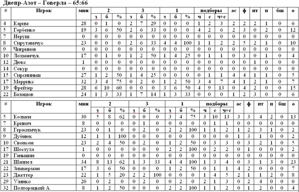Окончательно утратил сегодня все шансы на попадание в плей-офф «Днепр-Азот», для того чтобы иметь возможность замкнуть восьмёрку сильнейших, подопечным Чигринова нужно было побеждать во всех оставшихся играх. «Трёхцветные» в драматическом матче уступили на своём паркете «Говерле». Начали днепродзержинцы довольно неплохо, результативные броски Фрейзера и Карима сразу же вывели «Азот» вперёд. Стоило ивано-франковцам лишь немного сократить разницу в счёте, как тут же хозяева паркета отрывались ещё больше. В таком ключе игра проходила на протяжении тридцати минут, все три четверти «Говерла» была в роли догоняющих. Настоящим героем для команды Мурзина стал Шаппел. Уже в дебюте заключительной четверти защитник точным броском сравнял счёт, а спустя несколько минут гости уже были впереди. Интрига противостояния сохранялась вплоть до самой финальной сирены, решающим стал бросок всё того же Шаппела, который и установил окончательный счёт матча – 65:66 в пользу «Говерлы».