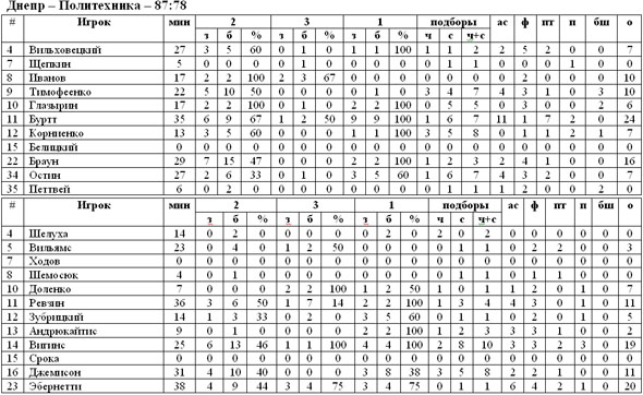 Продолжает погоню за «Ферро» и шестой строчкой турнирной таблицы «Днепр», сегодня подопечные Журавлёва на домашнем паркете смогли обыграть «Политехнику». К слову, для львовян этот матч был последним в сезоне, поэтому гости хотели провести его как можно ярче. Любопытным оказалось противостояние первых номеров обеих команд – Эбернетти и Буртта. Оба игрока сумели пересечь отметку в двадцать набранных пунктов, но победителем всё же вышел днепропетровский американец. «Бело-синие» вышли вперёд с первых минут. В целом игра проходила полностью под диктовку хозяев паркета. Команда Журавлева на протяжении всего игрового времени уверенно лидировала с преимуществом в 8-12 очков. Главная заслуга, безусловно, в игре всё того же Буртта. На счету Стивена практически трипл-дабл – 24 очка, 11 передач и 7 подборов. Финальная сирена зафиксировала победу «Днепра» с преимуществом в 9 очков – 87:78. Таким образом днепропетровцы поравнялись в турнирной таблице с запорожским «Ферро», но уступают команде Большакова по дополнительным показателям. Окончательное распределение мест мы узнаем уже в воскресенье, когда состоится целый ряд матчей последнего тура Суперлиги.