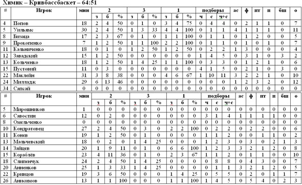 Предпоследний тур для «Химика» и «Кривбассбаскета» не имел особого турнирного значения. Южный давно смирился с местом вне зоны плей-офф, Кривой Рог же гарантированно забронировал за собой восьмую строчку. Первые пять минут на паркете велась равная борьба, не было ясно, кто именно сумеет сыграть роль первой скрипки, поэтому спустя шесть минут счёт на табло был 10:10. Кольченко и Милладж в нескольких атаках подряд смогли вывести свою команду вперёд на +5. У гостей традиционно результативно под щитами действовали Кораблёв и Зайцев, противостоял которым Маклейн (10 очков + 11 подборов). Остаток времени команды провели в том же темпе, «Химик» спокойно удерживал добытое преимущество, разница не превышала 7 пунктов. Набранные в концовке очки Попова, Маклейна и Бизаца сделали счёт 64:51 в пользу хозяев паркета, зафиксировав шестнадцатую победу южненцев в чемпионате.