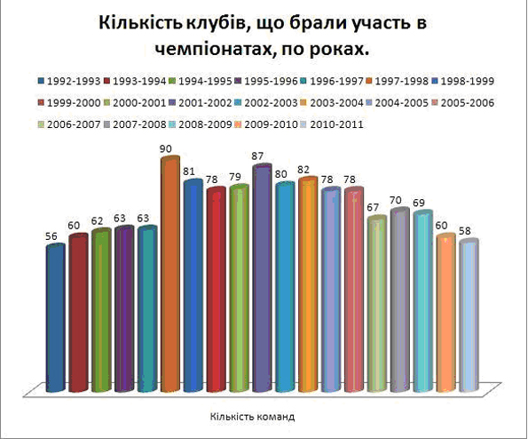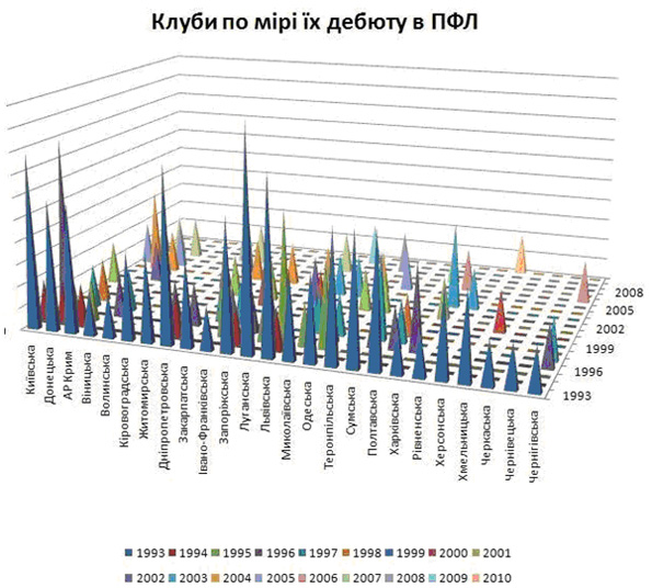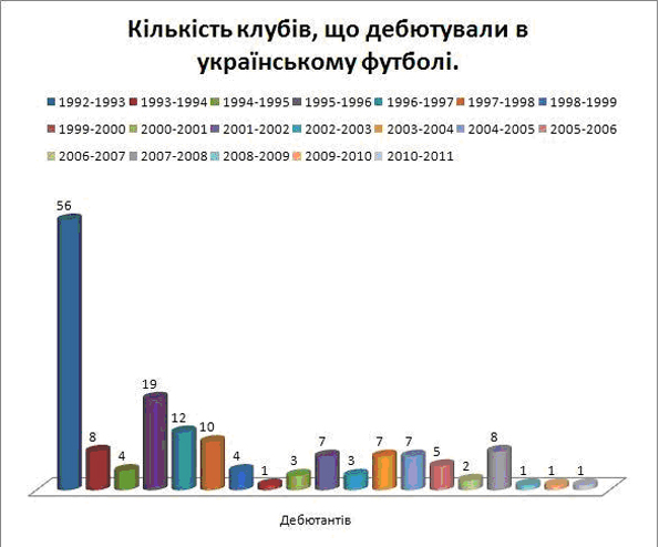 Для відображення ситуації у нашому футболі пропоную поглянути на діаграму, де відображається кількість клубів по мірі їх дебюту в ПФЛ.