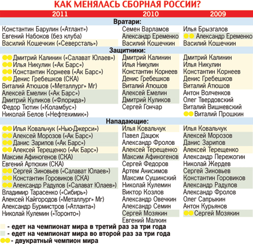 И главной неожиданностью стало отсутствие в сборной вратаря «Финикса» Ильи Брызгалова, показывавшего в нынешнем сезоне в НХЛ отличную игру. Но Быков, достигший накануне договоренности с другим энхаэловским стражем ворот, Евгением Набоковым, предпочел не сводить двух матерых медведей в одной маленькой берлоге. И чтобы Набоков не сомневался в том, что именно он первый номер сборной, отказался от услуг Брызгалова.