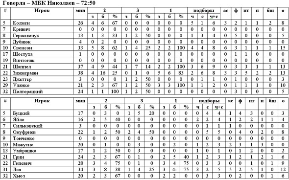 Закончилась серия противостояний, длиною в пять матчей, между ивано-франковской «Говерлой» и МБК Николаев. Подопечные Евгения Мурзина в решающей пятой встрече смогли более чем убедительно обыграть оппонента, оформив себе путёвку в следующий раунд. Началась игра для гостей довольно неплохо. Герой предыдущих противостояний Брайан Грин совершил проход под кольцо и заработал для своей команды два очка. Хозяева паркета через несколько секунд ответили выпадом Зиммермана – 2:2. Яйло и Хьюз в двух последующих атаках довели преимущество муниципалов до четырёх пунктов. Вся первая четверть прошла в равной, упорной борьбе, в которой лидера выделить было довольно сложно, при этом спустя десять минут игрового времени мы получили закономерный результат – 17:17. В следующем периоде франковцы заметно прибавили, при чём в основном переломить ход поединка подопечным Мурзина удалось за счёт дальних бросков. Свонсон, Герасимчук и Полторацкий мгновенно увеличили разрыв в счёте до двухзначной цифры, при этом в нападении у николаевцев совершенно ничего не клеилось. Несколько подряд потерь Грина, пасы в никуда от Лава и Буцкого привели лишь к 10-ти набранным очкам у «корабелов», в то время как их соперники отметились 23-мя пунктами. Вторая половина матча оказалась настоящим кошмаром для гостей. Если в третьей четверти николаевцам хоть как-то удавалось удерживать игру наравне с хозяевами паркета, то катастрофическое невезение в заключительные десять минут привели к разгрому. Мяч упорно не лез в кольцо после бросков с периметра, из трёхсекундной зоны, с линии штрафных. Финальная сирена зафиксировала крупную победу «Говерлы» со счётом 72:50