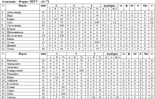 Началась встреча с двух точных бросков Томаса и Пустозвонова, хозяева паркета сразу же захватили инициативу в свои руки – 4:0. Несмотря на это, уже спустя несколько минут от преимущества подопечных Ярутиса не осталось и следа. Хантер, Кондрусевич и Бёрнс смогли организовать уверенный рывок 2:13 и вывели «Ферро» вперёд. Забегая вперёд, скажем, что после этого, до самой финальной сирены гостям удавалось не подпускать к себе в счёте соперника. До конца первой десятиминутки «бело-зелёные» существенно увеличили разрыв и отправились на первый короткий перерыв при счёте 13:26. Следующий период прошёл уже под диктовку «Азовмаша». Активные действия Карри и Хауса понемногу сокращали отставание, но выйти вперёд мариупольцам так и не удавалось. Во многом определяющим стал дебют второй половины встречи. В третьей четверти у хозяев паркета в атаке не клеилось абсолютно ничего, за отведённые десять минут подопечные Ярутиса смогли набрать лишь 8 очков, в то время как в копилке «Ферро» было 19. Таким образом, перед заключительным игровым отрезком счёт был 44:60. В оставшееся время действующему чемпиону так и не удалось что-либо изменить, матч, а вместе с ним и серия, завершились заслуженной победой «Ферро-ЗНТУ» со счётом 61:72.