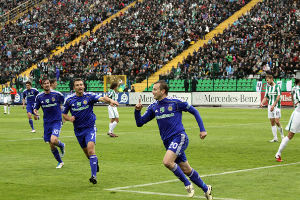 Гусев сделал длинную передачу, Шевченко, находившийся в оффсайде, остановился, а Огнен Вукоевич(Динамо К) проскочил неосмотрительно выскочившего Богатинова и из 47-го сектора закинул мяч в пустые ворота.
