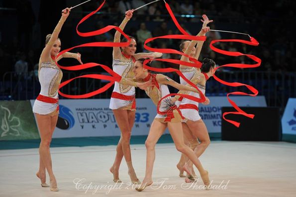В плане выразительности композиции украинок (особенно вторая – с обручами и лентами, составленная в ритме пасадобля) не уступают упражнениям соперниц. Более того, с точки зрения гармонии и стиля они, на мой субъективный взгляд, выглядят произведениями более законченными. Но перестроения и переброски у белорусок и итальянок, пожалуй, посложнее. Впрочем, все это – только мое субъективно-любительское мнение. Вообще, групповые упражнения – это вид программы, к которому еще в большей мере, чем к выступления «личниц» можно применить слова: «Иди, смотри и восторгайся, но понять нюансов не надейся». Композиционный рисунок здесь настолько замысловат, а движения настолько быстры и сложны, что порой просто невозможно понять, куда летят предметы и как переплетаются ноги-руки спортсменок...