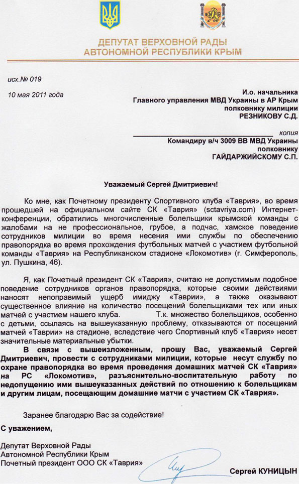 Во время недавней Интернет-конференции почетного президента «Таврии» Сергея Куницына болельщики выразили многочисленные замечания по неправомерным действиям сотрудников правоохранительных органов, обеспечивающих порядок на РС «Локомотив» во время домашних матчей симферопольской команды. Как и обещал Сергей Владимирович, он обратился с официальным письмом к руководителям милицейского главка автономии и Крымского территориального командования Внутренних воск МВД Украины с просьбой разобраться в ситуации и провести среди своих подчиненных соответствующую воспитательную работу с целью снять напряженность во взаимоотношениях между болельщиками и правоохранителями.