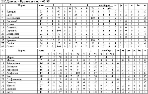 Началась встреча с точного штрафного Оуэнса и двухочкового попадания Кравцова, что позволило Донецку выйти вперёд – 0:3. Уже в следующей атаке Кис трёхочковым броском восстановил паритет, но Хукич равноценным попаданием вновь сделал хозяев паркета лидерами. Владеть инициативой команде Обрадовича удавалось вплоть до середины первой десятиминутки. Всё тот же Кис на пару с Уилсоном двумя бросками из-за дуги впервые вывели вперёд «Будивельник» – 10:16, как оказалось, после этого гости инициативу не упускали. Два точно исполненных штрафных Спенсера отправили команду на первый короткий перерыв при счёте 15:21. Вторая четверть прошла полностью под диктовку «гладиаторов», подопечные Беррокаля продолжали уверенно бомбардировать корзину соперника издали, в то время как донецкие баскетболисты демонстрировали низкий процент попадания. Броски с дистанции «Будивельнику» удавалось неплохо совмещать с результативными действиями Агафонова и Беттса из-под щита, что к концу четверти вылилось в +16 для киевлян (26:42). Вторая половина свелась к тому, что гости уверенно контролировали ход поединка, а донецкие баскетболисты безуспешно пытались отыграться. Спенсер, Кис и Уилсон позволили своей команде лидировать до самой финальной сирены, добыв в итоге уверенную победу со счётом 63:88. Серьёзную травму во время матча получил игрок БК Донецк – Андре Оуэнс. В одном из игровых эпизодов защитник пытался заблокировать Анисимова, но напрыгнул центровому на спину и упал на паркет вниз головой, потеряв сознание. На данный момент игроку Донецка оказывается медицинская помощь, о серьёзности полученной травмы пока ничего не известно.