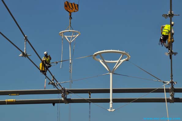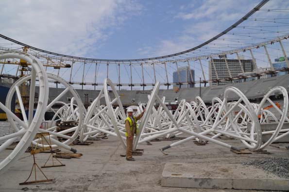 А показатьпредставителям СМИ господин Колесников хотел, как устанавливаются подвесные конструкции, так называемые «зонтики», которые потом будут использованы для создания натяжения будущего мембранного покрытия крыши стадиона. И именно благодаря зонтикам крыша будет иметь характерную волнистую форму.Сейчас таких зонтиков над «Олимпийским» двадцать один, а должно быть 640. Чтобы успеть в срок, до середины июня, работы ведутся в две смены. А уже с июля, когда начнут подъем «лепестковой арены» и монтаж сидений, работы будет еще больше. Но никто не жалуется – все во благо будущего Евро.