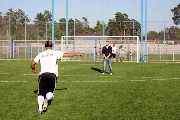 Помните, как в одном из рекламных роликов Криштиану Роналду бил метров с 20 по воротам и на линии стоял человек с поднятыми вверх руками? Роналду попадал аккурат ему между рук. Роберто Карлос без колебаний согласился повторить подобный трюк. Я встал к штанге, поднял руки вверх и приготовился... Карлос справился с заданием с первого же удара! Видно было, что любое предложение сделать что-нибудь эдакое бразильца по-хорошему заводит. Это была очень веселая и позитивная съёмка. Теперь впереди монтаж. Жалко, что Роберто Карлос не сможет принять участие в этом процессе. :-)