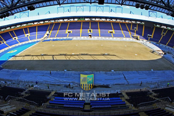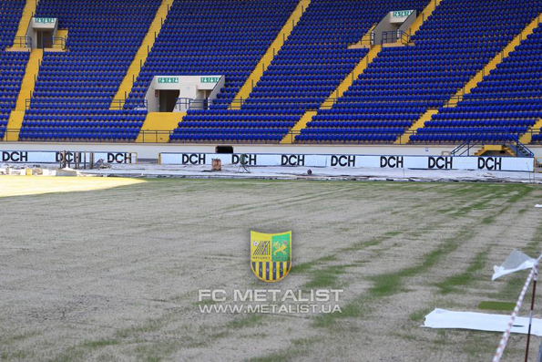 Предлагаем вашему вниманию фотографии реконструкции футбольного поля стадиона «Металлист», где уже появились первые ростки будущего футбольного «ковра».
