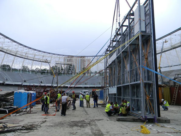 Вчера около 22.00 на главной спортивной арене Евро-2012 — НСК «Олимпийский» — с северной («бессарабской») стороны было поднято и установлено первое электронное табло. Подготовительные работы для подобной операции проходят долго и с особой тщательностью. Новые табло НСК имеют площадь более 103 квадратных метров с аспектным соотношением экрана 16:9.