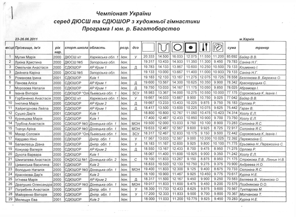 С 23 по 26 июня в Харькове прошел чемпионат Украины по художественной гимнастике среди ДЮСШ и СДЮШОР. Соревнования состоялись в спорткомплексе «Политехник», всего в них приняли участие почти 400 юных спортсменок. За ходом чемпионата внимательно наблюдала тренер сборной Украины по художественной гимнастике Альбина Дерюгина. В командном первенстве ожидаемо лидировали киевляне, занявшие первое и третье места, на второй строчке расположилась первая команда Крыма.