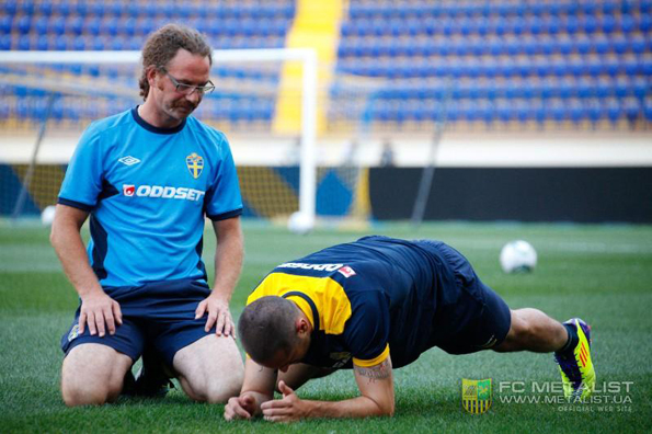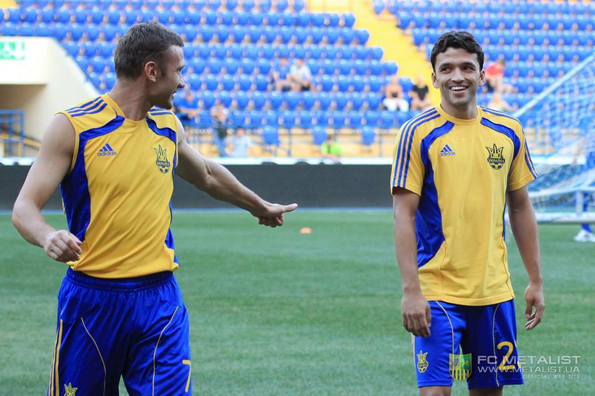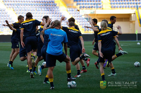 Вчера вечером, друг за другом, на новом поле стадиона «Металлист» провели свою тренировку игроки сборных Швеции и Украины.