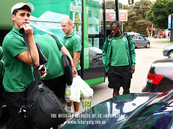 Літак із «зелено-білими» на борту вилетів з львівського аеропорту о 13:30. Окрім гравців, тренерів та обслуговуючого персоналу команди в складі карпатівської делегації також працівники клубу, журналісти і група фанатів. Останні разом з вболівальниками «Карпат», що мешкають на теренах Греції, мають забезпечити належну підтримку нашій команді на трибунах «Тоумби».