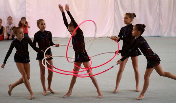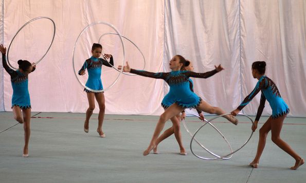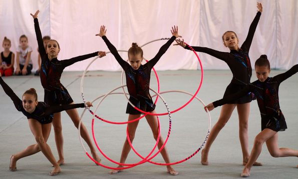 Групповое упражнение «пять обручей» исполняют подопечные тренера ДЮСШ №1 Людмилы Дуплийчук
