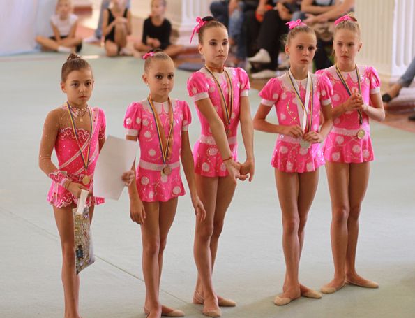 Победительница областного чемпионата среди гимнасток 1999 года рождения в окружении сестер – близняшек из Измаила Юлии и Алины Фуклевых